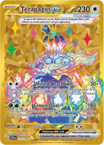 Corona Astral salió en septiembre de 2024 y fue la séptima expansión de la serie Escarlata y Púrpura con una propuesta que no se andaba con rodeos: Teratipo Astral, Pokémon con poderes estelares, y un diseño que parecía sacado de una constelación con presupuesto. Aunque Corona Astral es una colección del juego de cartas, tomaba inspiración directa del videojuego Pokémon Escarlata y Púrpura, específicamente del DLC El disco índigo. Este contenido adicional introdujo nuevos Pokémon como Terapagos, que se convirtió en el protagonista del set. Así, muchas cartas de Corona Astral reflejan criaturas, escenarios y conceptos que debutaron en ese DLC, conectando el universo del TCG con el lore más reciente del juego principal.